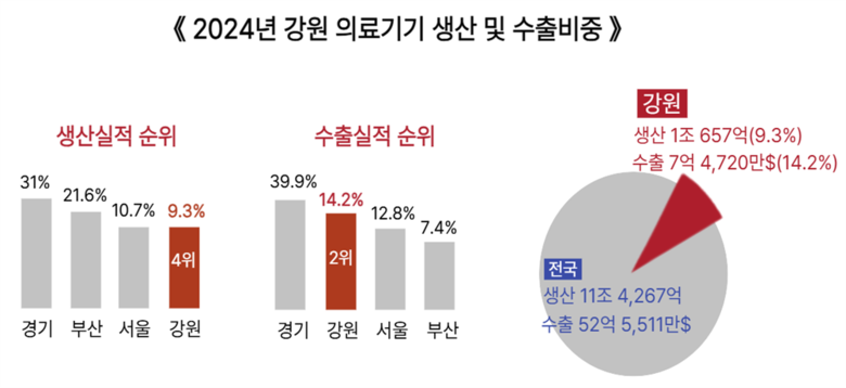- “1위인 경기도와 인구에서 9배 차이 나는 상황에서 이룬 값진 성과” [강원도 세계타임즈=김민석 기자] 강원특별자치도(도지사 김진태)는 식품의약품안전처가 발표한 「2024년 의료기기 생산 및 수출입 실적 통계자료(2025.5.28.)」에 따르면, 강원도 의료기기 산업 수출 실적이 전국 2위를 기록했다고 밝혔다.