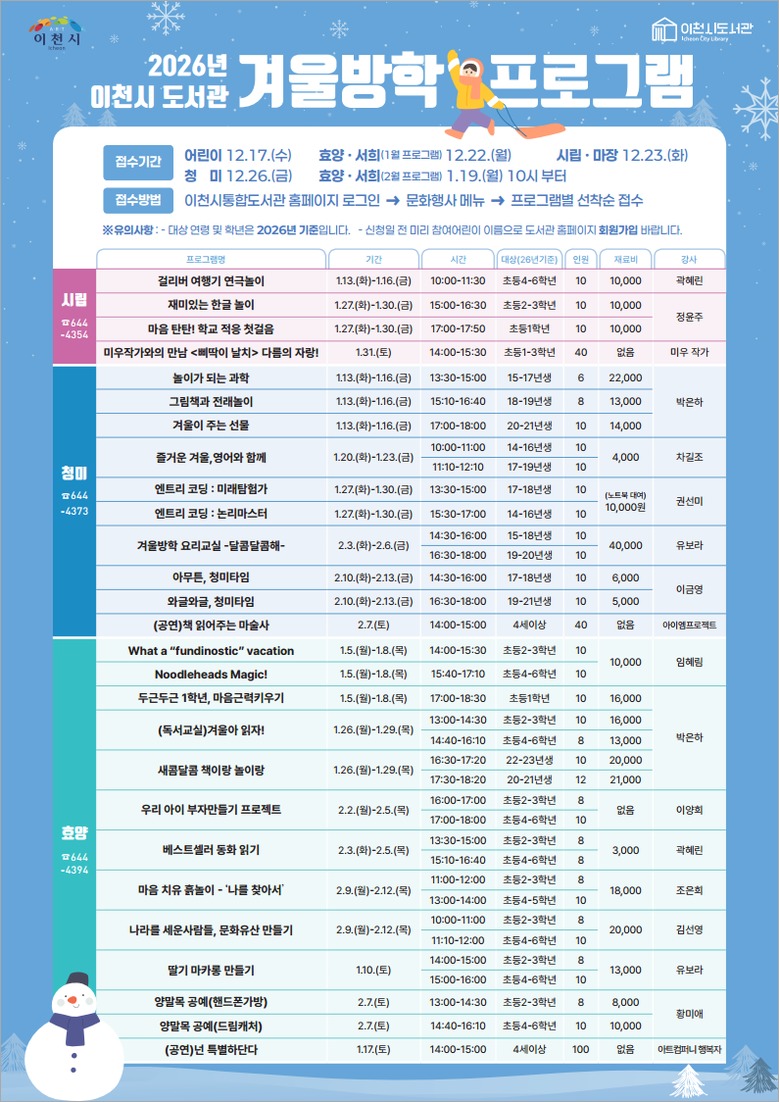 이번 겨울방학 프로그램은 이천시 관내 6개 공공도서관(시립·청미·어린이·효양·마장·서희도서관)에서 진행되며, 독서교실을 비롯해 작가와의 만남, 만들기 체험, 공연 등 다채로운 프로그램을 마련해 방학 기간 어린이들의 독서문화 활동을 지원하고 도서관 이용 활성화를 도모할 예정이다.