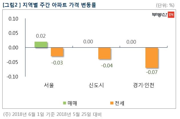 부동산114(www.r114.com)에 따르면 금주 서울 아파트값은 0.02% 올라 지난주와 동일한 변동률을 보였다. 지난주 하락세로 돌아섰던 신도시와 경기ㆍ인천은 이번 주 변동 없이 각각 보합세를 나타냈다.