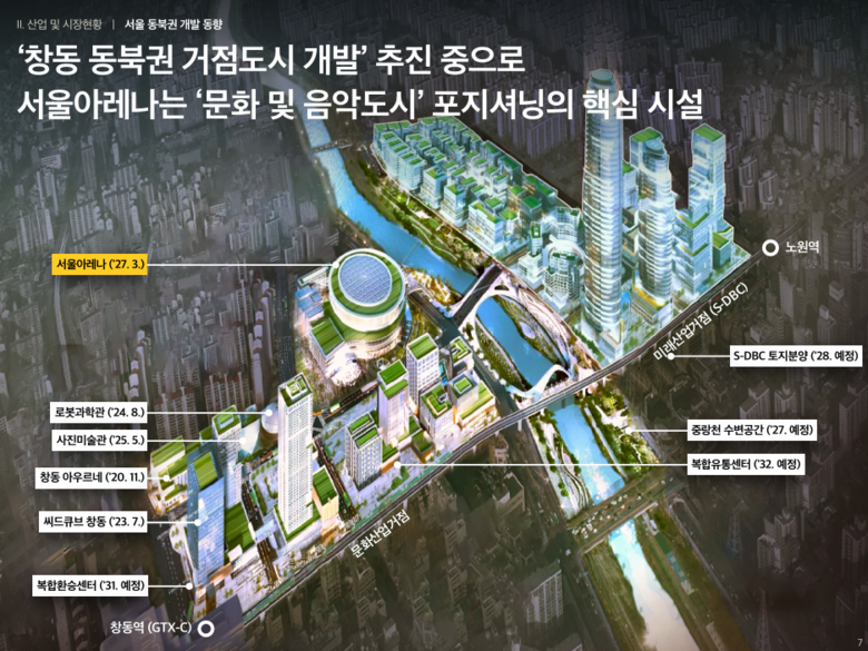 서울아레나는 국내 최초로 글로벌 수준의 인프라를 갖춘 대형 음악 전문 공연장으로 ‘다시 강북 전성시대’ 실천의 첫 걸음인 창동‧상계 문화‧바이오 복합도시 중 문화예술거점의 핵심 시설이다.