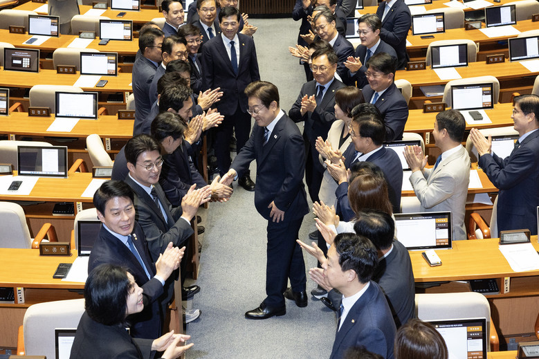 [세계타임즈 = 신상철 기자] 이재명 대통령이 26일 국회에서 추가경정예산 시정연설을 위해 본회의장에 입장해 더불어민주당 의원들의 박수를 받으며 인사하고 있다. 2025.6.26