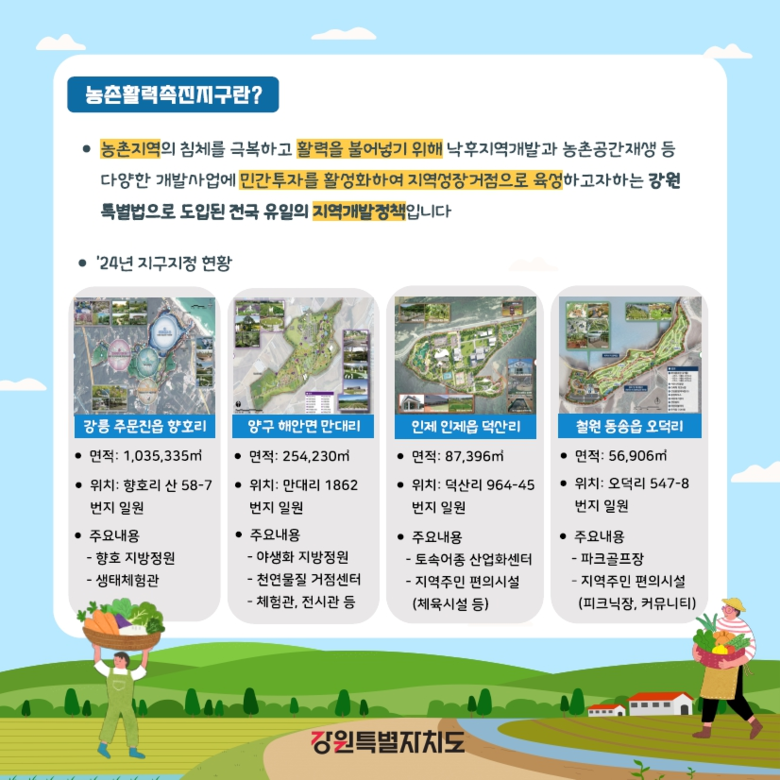 강원특별법 시행 이후 현재까지 두 차례에 걸쳐 농촌활력촉진지구가 지정‧고시되었으며, 총 6개 시군 9개 지구(강릉 1, 횡성 1, 철원 2, 화천 1, 양구 1, 인제 3)에서 약 35만 평 규모의 농업진흥지역이 해제되었다.