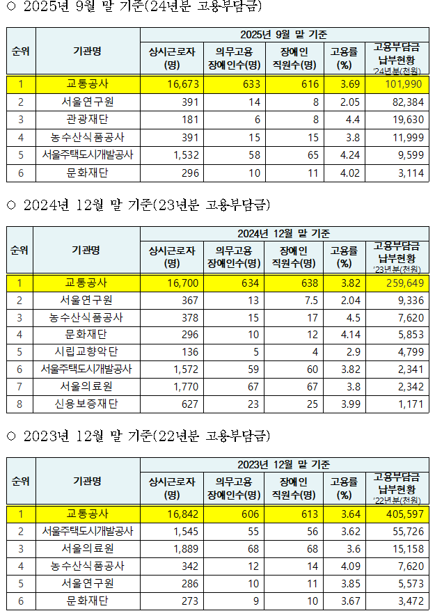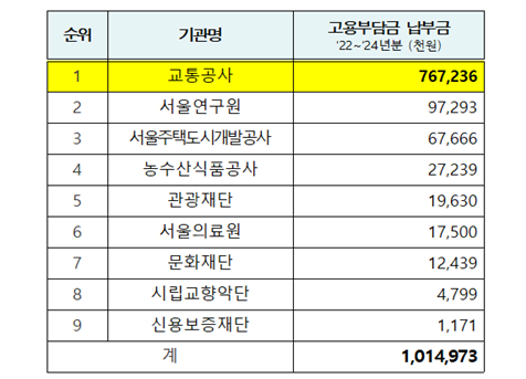 서울특별시의회 교통위원회 김원중 의원(성북2, 국민의힘)은 11월 11일 서울교통공사를 대상으로 한 행정사무감사에서 확인한 자료에 따르면 최근 3년간(2022~2024년) 서울시 출자·출연기관이 납부한 장애인고용부담금은 총 10억 1,497만 원이며, 이 중 서울교통공사가 7억 6,723만 원을 납부하여 최고 금액을 기록하고 있다.