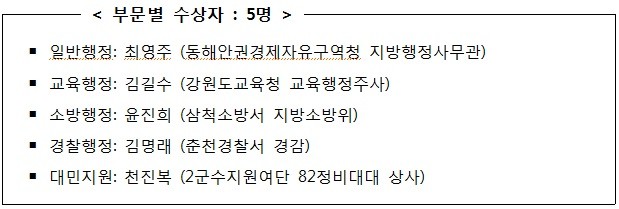 개원 기념식에 이어서, 오전 11시부터는 춘천 베어스호텔에서 「제20회 강원목민봉사대상 시상식」을 개최하여 수상자, 전·현직도의원, 역대 수상자, 기관단체장 등 150여명이 참석한 가운데 어려운 여건 속에서도 지역사회 발전과 주민복리를 위해 헌신적으로 봉사한 공직자를 포상.격려할 계획이다.