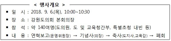 [강원도=세계타임즈 김민석 기자] 강원도의회는 9. 6.(목) 10:00에 본회의장에서 한금석 의장을 비롯해 최문순 도지사, 민병희 교육감, 역대 도의원, 작은학교 학생 등 140여명이 참석한 가운데 ‘제62주년 개원 기념식’을 개최한다고 밝혔다.