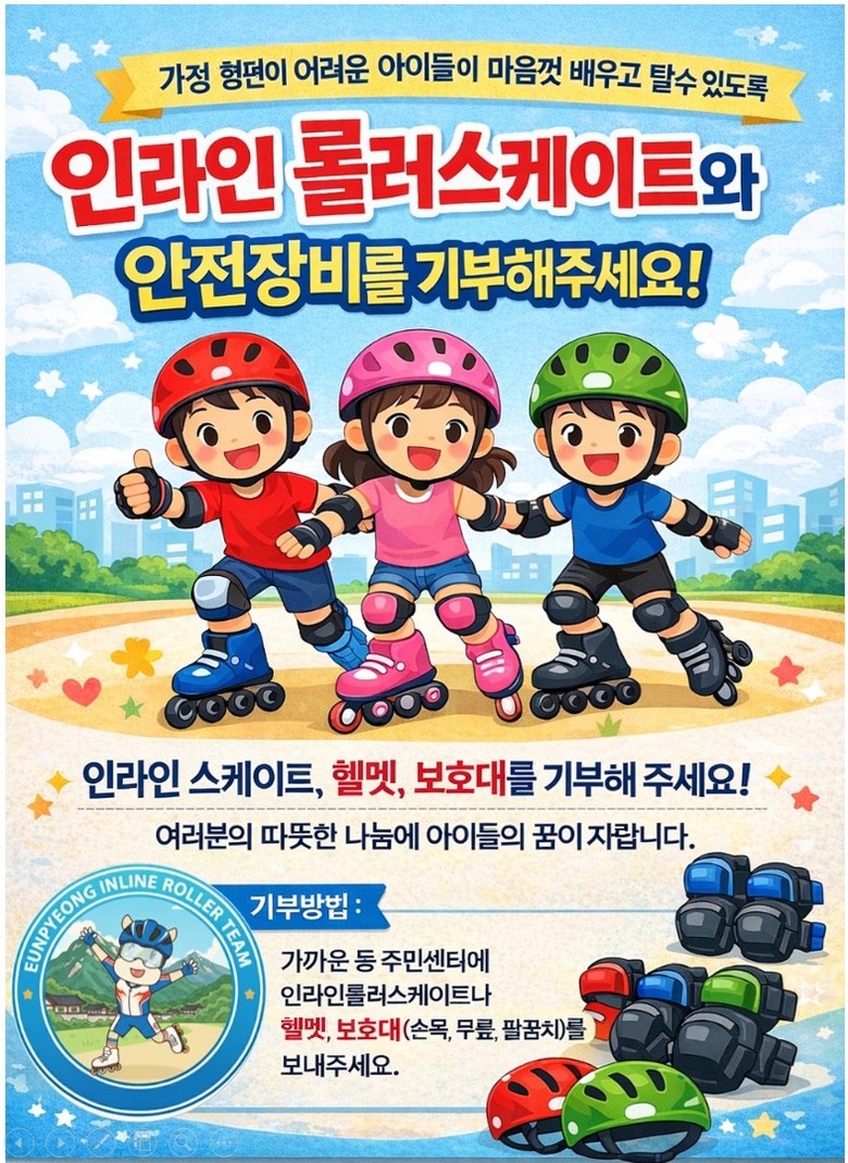 - 기부 물품은 동 주민센터 또는 은평구 생활체육과로 제출 [은평구 세계타임즈=이장성 기자] 서울 은평구(구청장 김미경)는 가정형편 등으로 체육활동 참여가 어려운 아동을 지원하기 위해 인라인 롤러스케이트 및 안전장비 기부 캠페인을 연중 운영한다고 밝혔다.