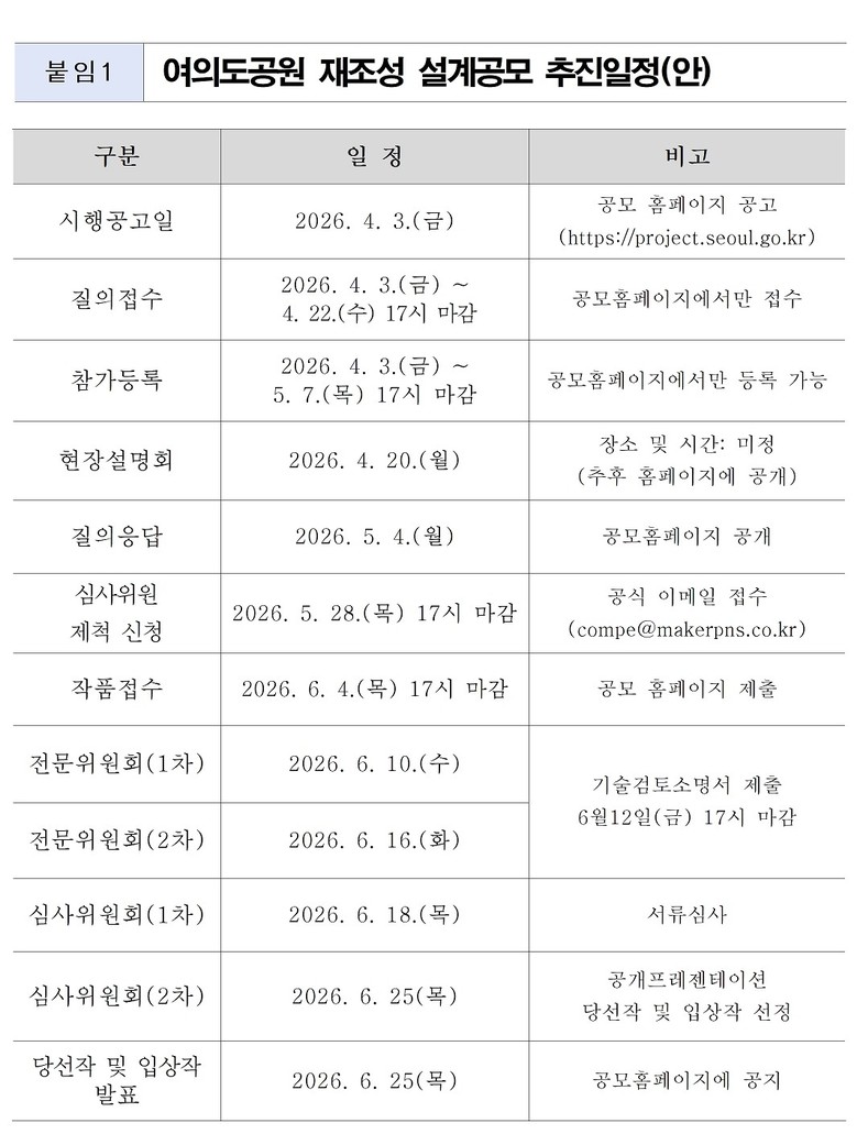 김영환 서울시 정원도시국장은 “이번 공모를 통해 시민들에게 꾸준히 사랑받아 왔던 여의도공원이 한층 더 격상된 국제적 관광명소로 재탄생될 수 있도록 많은 참여를 기대한다”라고 말했다.
