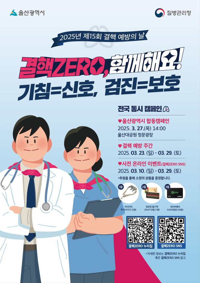 오는 3월 27일에는 울산대공원 정문광장에서 울산시, 구·군 보건소, 대한결핵협회 울산경남지부, 울산시 감염병관리지원단이 함께하는 합동 홍보(캠페인)을 개최해 시민들에게 결핵의 위험과 예방수칙 등을 홍보하는 한편, 검진 버스를 이용한 이동검진도 제공할 계획이다.