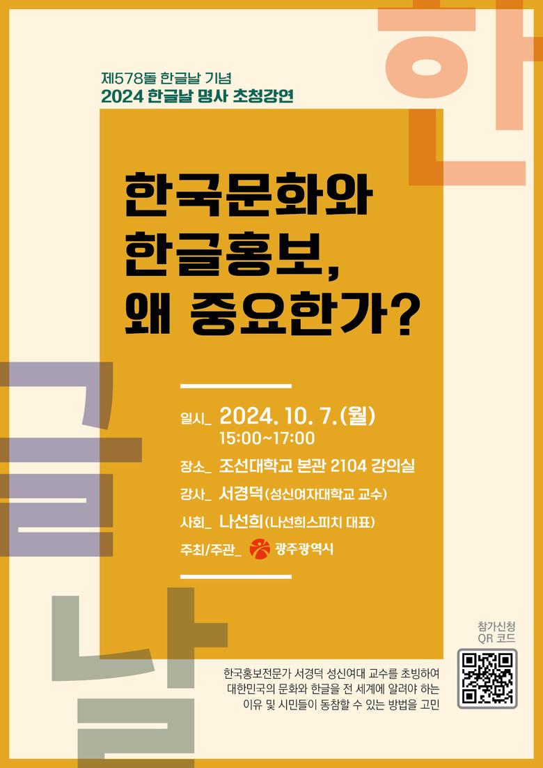 이날 강연은 누구나 무료로 참여할 수 있으며, 광주시 누리집 공지사항에서 정보무늬(QR코드)로 사전 접수하거나 현장에서 신청할 수 있다.