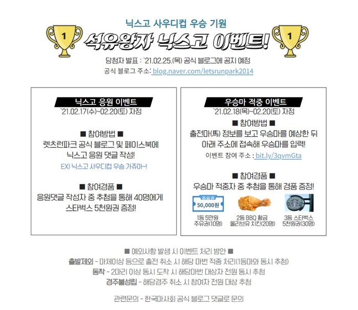 ‘닉스고’의 우승을 기원하는 내용의 SNS댓글을 달면 추첨을 통해 40인에게 커피 상품권을 제공한다. 우승마 예상 이벤트는 사우디컵의 우승마를 예상해 마번을 제출하면 된다. 사우디컵을 보다 적극적으로 즐길 수 있는 우승마 예상 이벤트에는 5만원 상당의 주유권 10매, 치킨 상품권 20매 등 푸짐한 상품이 준비되어 있다. 두 이벤트 모두 20일 자정까지 진행되며, 관련 자세한 내용은 한국마사회 공식 SNS채널에서 확인할 수 있다.
