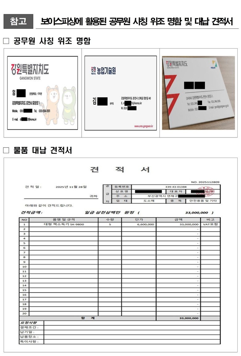 ○ 2025.10.13. 도 소속 A 공무원을 사칭한 자가 민간업체 B씨에게 사업 추진 명목으로 특정 업체의 자재 발주를 요청한 사례