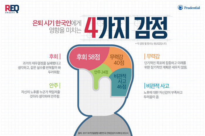 은퇴감성지수는 2006년 미국 푸르덴셜생명과 미국 코네티컷 대학교 연구팀이 은퇴 시기 사람들에게 발생하는 행동학적 리스크에 대한 조사와 금융결정에 영향을 미치는 감정적 요인에 대한 분석을 통해 개발됐다. 푸르덴셜생명은 이 연구를 기초로 올해 45세부터 69세의 한국 은퇴(예정)자 803명을 대상으로 ‘은퇴감성지수’ 조사를 진행했다.