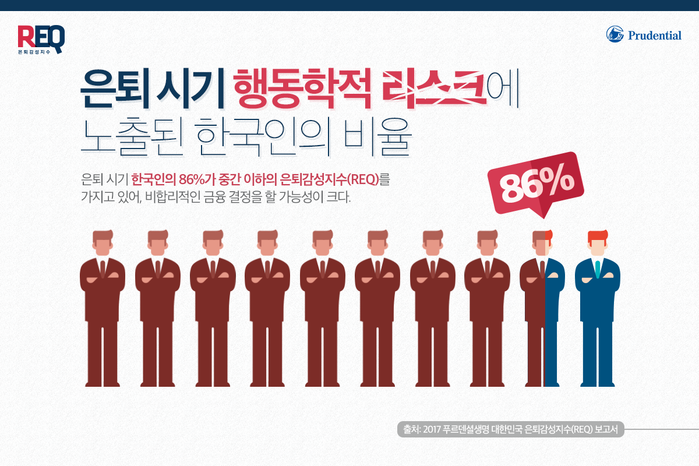 ‘2017 대한민국 은퇴감성지수 보고서’에 따르면 한국인의 86%가 중간 이하의 은퇴감성지수를 기록해 5명 중 4명 이상이 감정으로 인한 은퇴 준비의 위험에 노출되어있는 것으로 나타났다. 또한 은퇴 시기 한국인들의 금융 결정에 영향을 미치는 감정은 ▲후회 ▲비관적 사고 ▲무력감 ▲안주 네 가지로 나타났다.