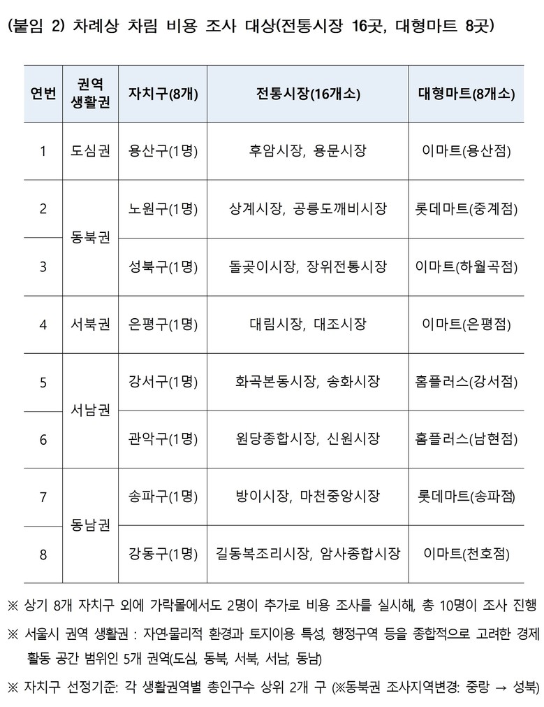 이번 조사는 추석 명절 약 2주 전인 22일(월) 서울시 물가조사 모니터단과 공사 어르신 일자리 가격조사요원 총 10명이 용산구 용문시장 등 전통시장 16곳, 롯데마트 등 대형마트 8곳, 가락시장에 위치한 가락몰을 직접 방문해 이뤄졌다.