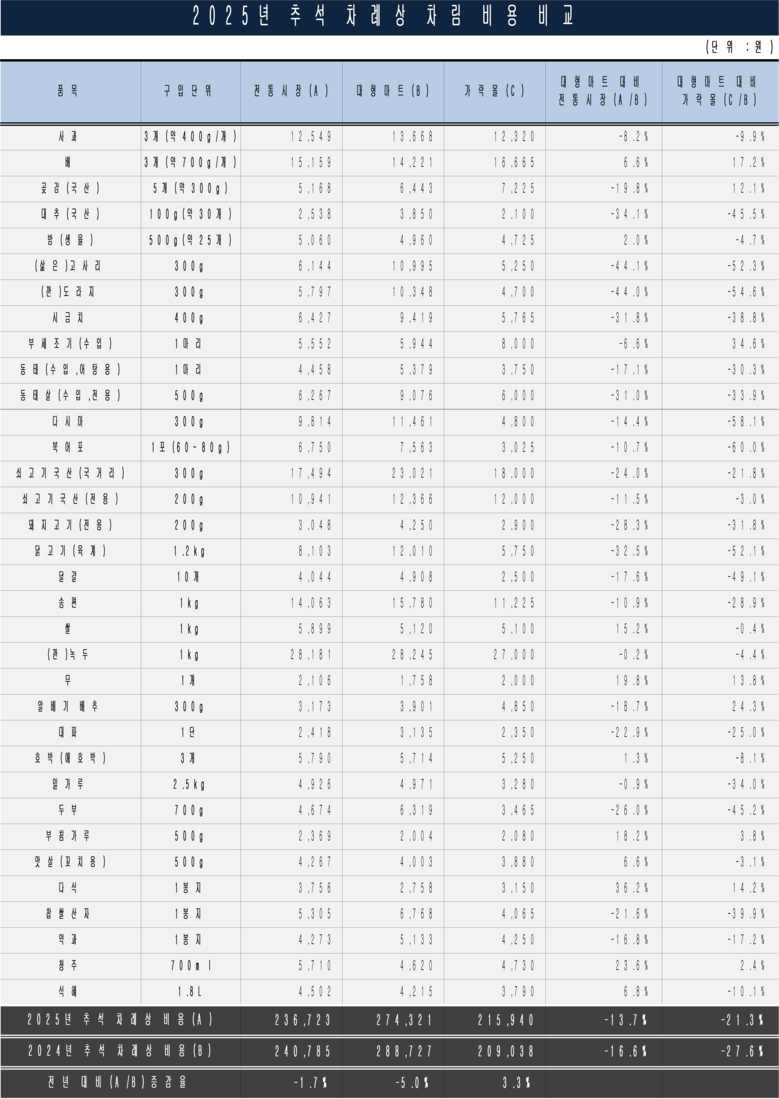 (붙임 1-1) 2025년 추석 차례상 비용 조사 결과(비교표)