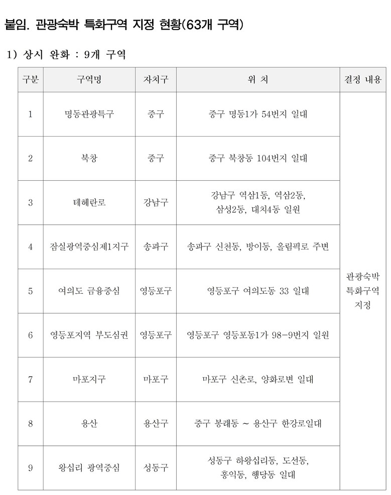 관광숙박 특화 지구단위계획은 관광수요가 집중되는 지역과 교통접근성이 양호한 지역을 중심으로, 명동, 강남 테헤란로, 여의도 금융중심 등 9개 구역은 지속적으로 숙박시설 공급을 지원하고, 상권이 활성화된 신촌 등 54개 구역에는 3년 한시적으로 용적률 완화를 적용해 시장 수요 변화에 유연하게 대응할 수 있도록 했다.