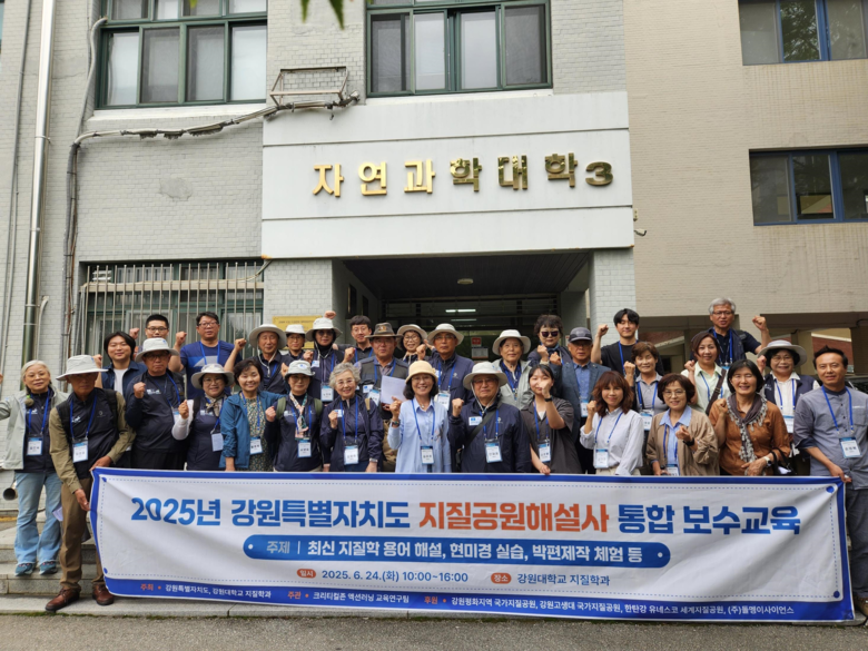 [강원도 세계타임즈=김민석 기자] 강원특별자치도(도지사 김진태)는 6월 24일(화) 강원대학교 지질학과(춘천시 소재)에서 도내 지질공원해설사 30명을 대상으로 「2025년 강원특별자치도 지질공원해설사 통합 보수교육」을 성공적으로 개최했다고 밝혔다.