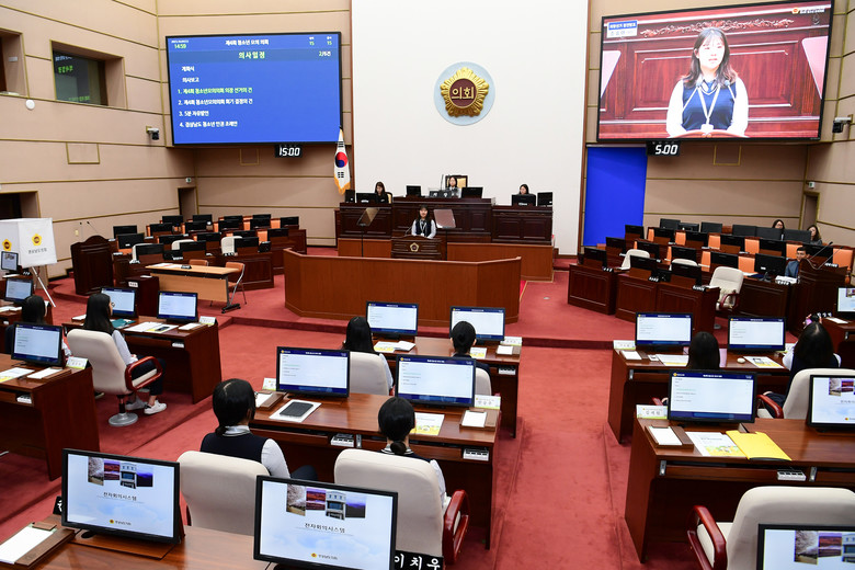 경상남도의회 청소년 모의의회는 지난 6월 함안 군북초등학교를 시작으로 총 5회에 걸쳐 102명의 학생들에게 의정 체험의 기회를 제공하였다.