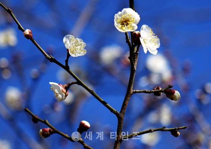 봄 기운이 일어선다는 입춘(立春)이 지난지 일주일째인 10일 오전 매서운 추위가 옷깃을 여미게 하고 있는 가운데, 울산시청 햇빛광장에 서 있는 매화나무에서 매화꽃망울이 툭툭 터지고 있다. 2017.02.10.