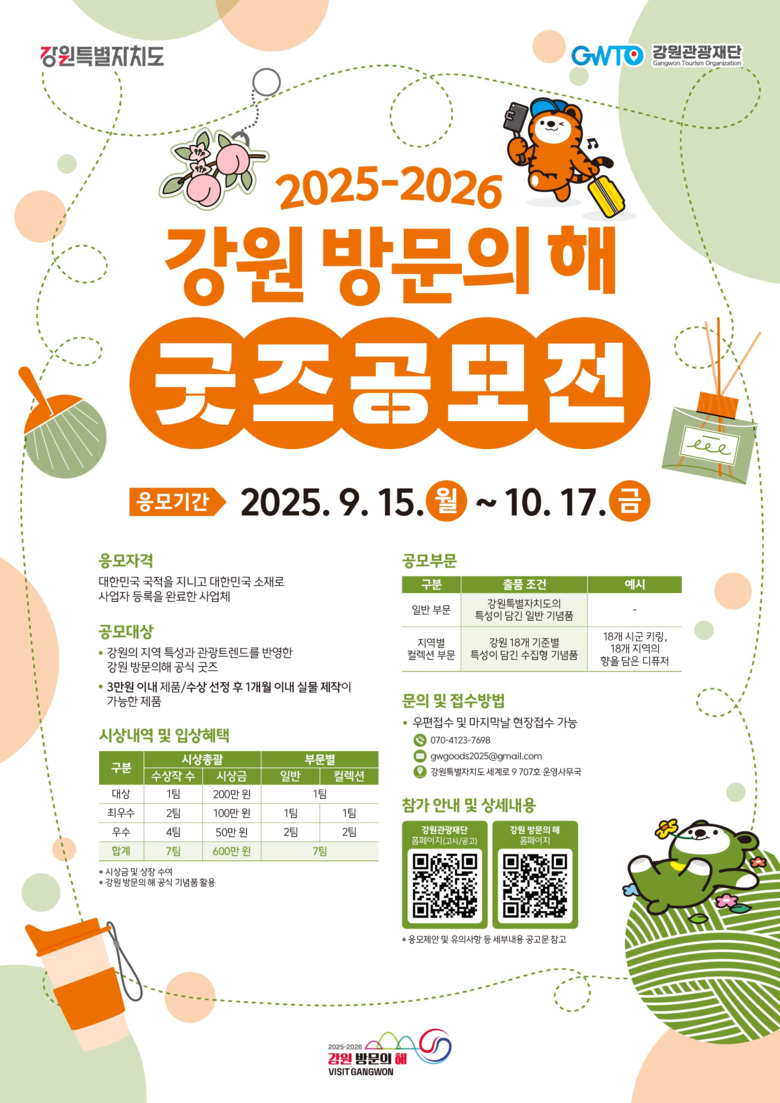 자세한 내용은 강원관광재단 누리집 고시/공고(www.gwto.or.kr) 및 강원 방문의 해 누리집(visitgw2526.kr)에서 확인할 수 있다.