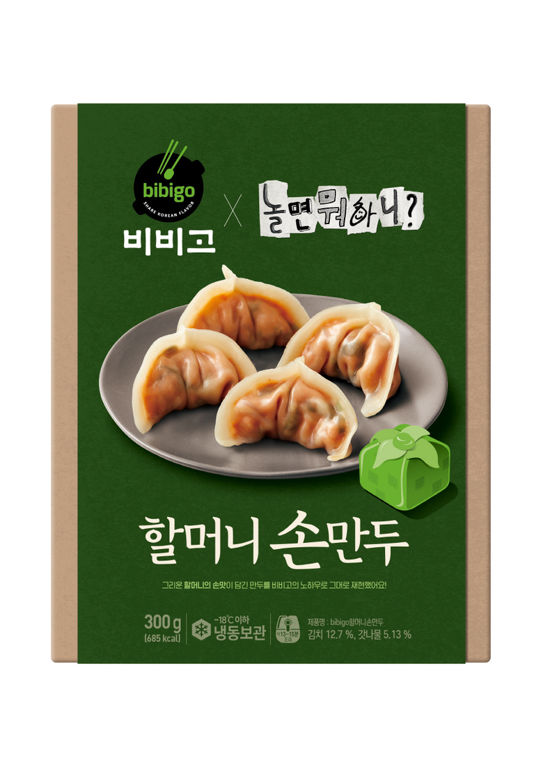 ‘비비고X<놀면 뭐하니?> 할머니 손만두’는 할머니의 고향인 강원도 정선에서 주로 사용하는 청갓과 배추를 절여 넣어 아삭한 식감을 살렸으며, 고춧가루와 고추장으로 매콤하면서도 칼칼한 맛을 더했다. 이와 함께 평소 만둣국을 자주 만들어 먹었다는 사연을 토대로 만둣국에 최적화된 레시피를 개발했다.