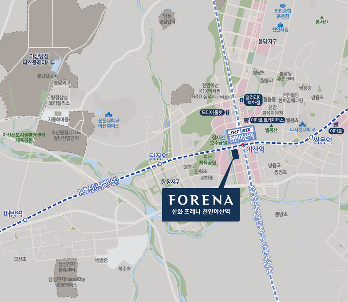 한화 포레나 천안아산역은 천안아산역(KTX·SRT), 아산역(1호선) 바로 앞에 들어서는 만큼 교통 및 생활 인프라 면에서 매우 우수한 입지를 갖췄다. 단지는 KTX·SRT 노선이 지나가는 천안아산역(도보 5분)과 지하철 1호선 아산역(도보 1분)을 인접하고 있는 더블역세권 단지다. KTX 이용 시 서울역까지 40분대, SRT 이용 시 수서역까지 30분대로 접근이 가능해 서울 중심권역으로 빠르게 이동할 수 있으며, 이 외에도 부산 110분, 대구 70분, 광주 70분 등 전국 주요도시로 2시간 이내 접근이 가능하다.