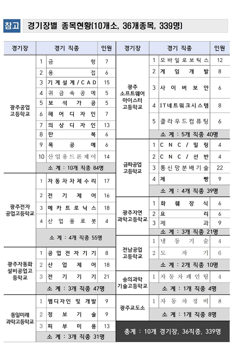 이번 대회에는 금형, 용접, 자동차 차체수리, 헤어디자인, 의상디자인, 메카트로닉스, 산업용 로봇, 모바일 로보틱스, 게임 개발, 사이버 보안 등 36개 직종 339명의 선수가 참가해 실력을 겨룬다.