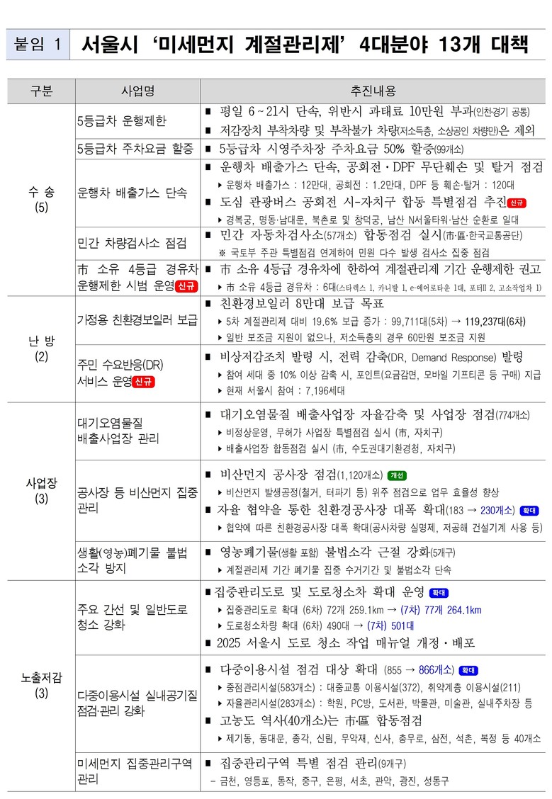 - 5등급 차량 운행 제한, 친환경보일러 보급, 도로·다중이용시설 등 관리 강화
