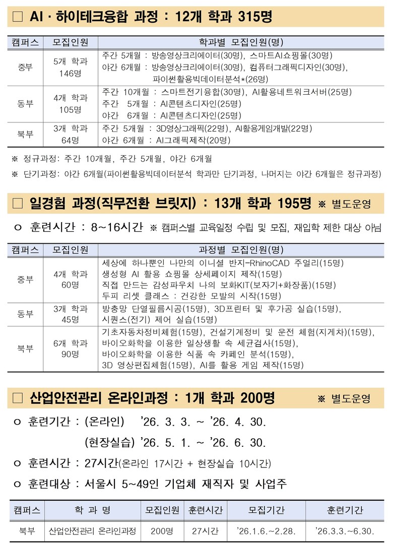 시는 급변하는 산업환경 속에서 시민의 진로 목적에 맞는 직업훈련이 이뤄질 수 있도록, 2026년부터 서울시 기술교육원 교육과정을 ▴중장년 특화과정 ▴기업협력형 과정 ▴전문기술과정 ▴국가기술자격(산업기사) 과정 ▴AI・하이테크 융합과정 ▴일경험(직무전환 브릿지) 과정 등 6개 유형의 맞춤형 특화 교육과정 체계로 운영한다.