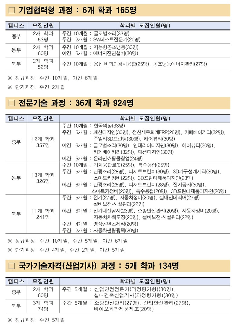 이번 상반기에는 총 77개 학과에서 2,004명을 모집하며, ▴중장년 특화과정 18개 학과 466명 ▴기업협력형 과정 6개 학과 165명 ▴전문기술과정 36개 학과 924명 ▴국가기술자격 과정 5개 학과 134명 ▴AI・하이테크 융합과정 12개 학과 315명이다.