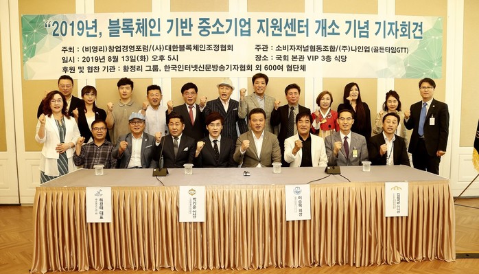 “2019년 블록체인 기반의 중소기업 지원센터 개소” 기자회견이 13일 오후 5시 여의도 국회본관 3층 귀빈식당에서 개최됐다.
