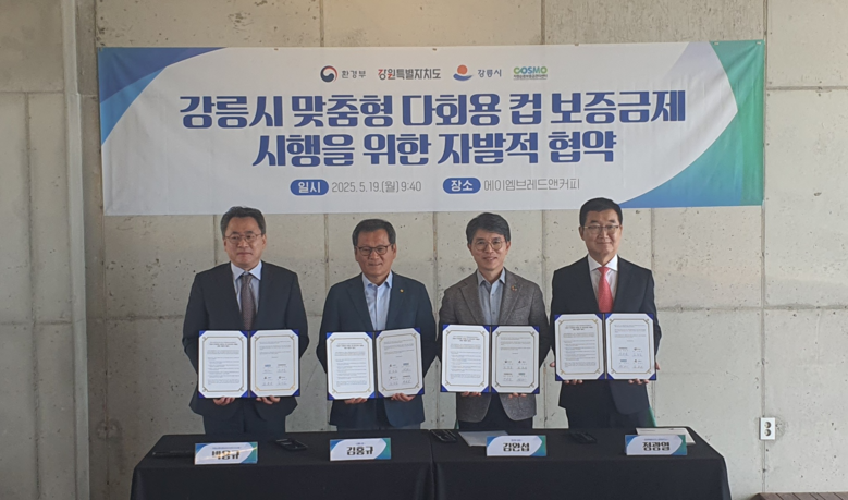 [강원도 세계타임즈=김민석 기자] 강원특별자치도(도지사 김진태)는 5월 19일(월) 오전 9시 40분, 강릉시 ‘카페인 에이엠’에서 환경부, 강릉시, 자원순환보증금관리센터와 함께 ‘강릉시 맞춤형 다회용 컵 보증금제 시행 및 재사용 촉진’을 위한 자발적 협약을 체결했다고 밝혔다.