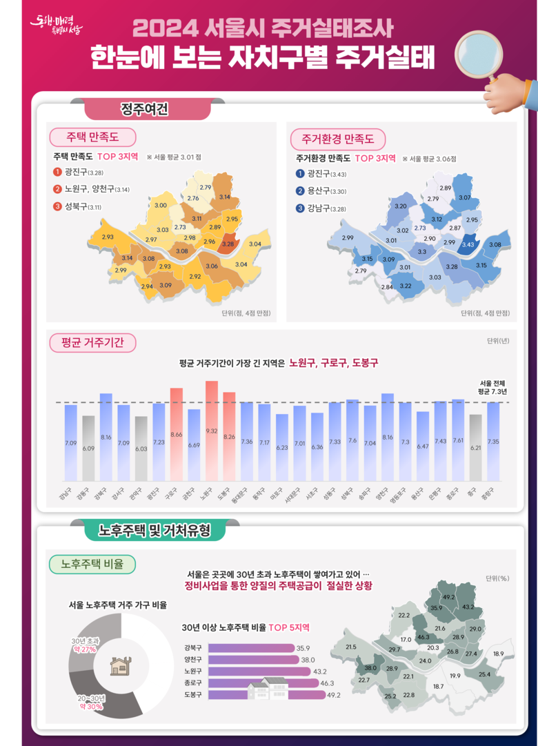 서울시는 ‘2024 서울시 주거실태조사’ 표본을 1만 5천 가구로 확대해 조사한 결과를 이같이 밝히고, 자치구별 주거실태 지표 11종을 최초로 공개해 지역 특성을 반영한 맞춤형 정책 수립 기반을 마련했다고 설명했다.
