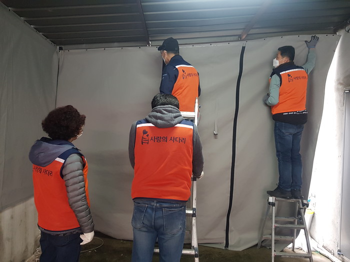 이날 봉사에는 천정훈 단장을 비롯해서 박준영 안성호 유희자 회원들이 1층 주차장 공간에 천막을 설치 하였다.