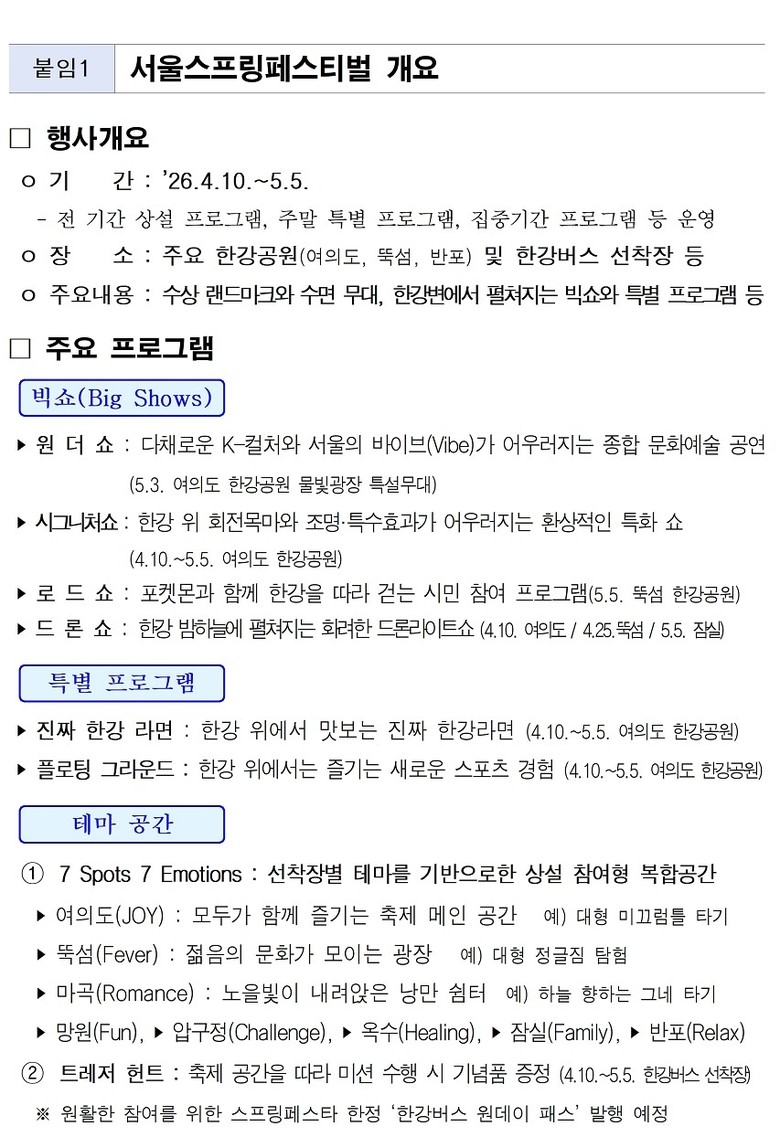 원더쇼, 로드쇼 등 축제의 세부 프로그램 내용과 참여 방법은 공식 누리집(seoulfestival.kr)과 인스타그램(@seoulspringfestival_official)을 통해 순차적으로 공지될 예정이다.