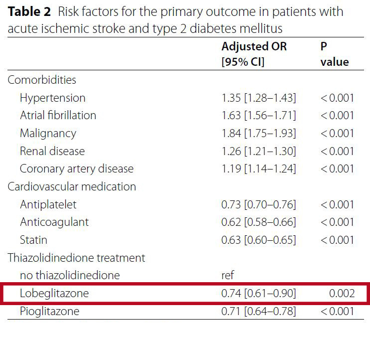 뇌경색 이후 추적 기간 내에 심뇌혈관질환 혹은 사망이 발생한 20,869명의 환자와 발생하지 않은 62,607명의 환자의 데이터를 비교한 결과, 로베글리타존을 사용한 그룹에서 심뇌혈관질환 및 사망 발생 위험이 약 26% 낮은 것으로 나타났다. 로베글리타존 사용과 심부전 발생 사이에는 연관성이 없었다.