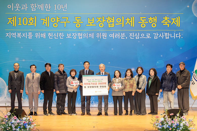 이날 행사에서는 각 동 보장협의체 12명의 위원장으로 구성된 동 보장협의체 연합회가 성금 200만 원을 기탁하며 이웃사랑 실천과 나눔문화 확산에 솔선수범했다. 동 보장협의체 연합회는 올해 영남지역 산불 피해 및 계양구 관내 취약계층 수해 가구를 위한 성금을 기탁한 바 있다.