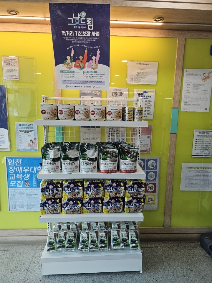 인천시에서는 인천시 기부식품등지원센터(광역푸드뱅크)가 참여해 매주 수요일 오전 10~12시 인천사회복지회관(남동구 간석동 소재) 1층에서 시범 운영한다. 생계가 어려운 시민 누구나 방문하면 매주 50명 범위에서 별도의 신청 절차 없이 라면, 즉석밥, 조미김 등 1인당 3~5개 품목(2만 원 상당)의 먹거리·생필품을 지원받을 수 있다.