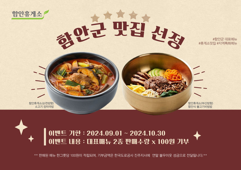 함안군 맛집 선정 기념으로 함안휴게소에서 판매된 대표메뉴 2종 한 그릇당 100원이 적립되며, 해당 기부 이벤트는 10월 30일까지 진행된다. 적립된 금액은 연말 불우이웃돕기 성금으로 모아져 한국도로공사 진주지사에 전달될 예정이다.