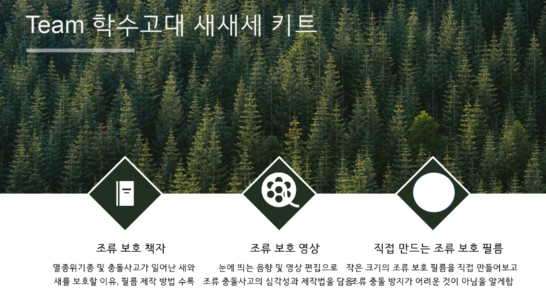 그중 환경부와 국립생태원이 발표한 ‘인공구조물에 의한 야생조류 폐사 방지 대책 수립’보고서를 통해 투명 방음벽이나 건물 유리창에 부딪혀 사망하는 새가 한 해 780만 마리에 달한다는 사실을 알고 ‘새와 우리들의 새로운 세상’이라는 주제로 조류 충돌 방지 프로젝트를 진행한 학수고대 팀이 우수팀으로 선정되었다.