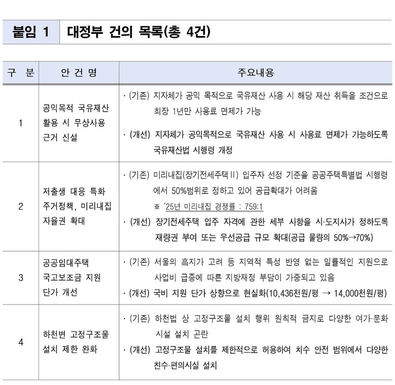 이번 개선 건의는 ▴중앙-지방 간 국공유재산 활용 협력 강화를 위한 무상사용 근거 신설 ▴미리내집 공급 확대를 위한 법령 개정 ▴공공 임대주택 국고보조금 지원기준 현실화 ▴하천변 고정구조물 설치 제한 완화 등 총 4건이다.