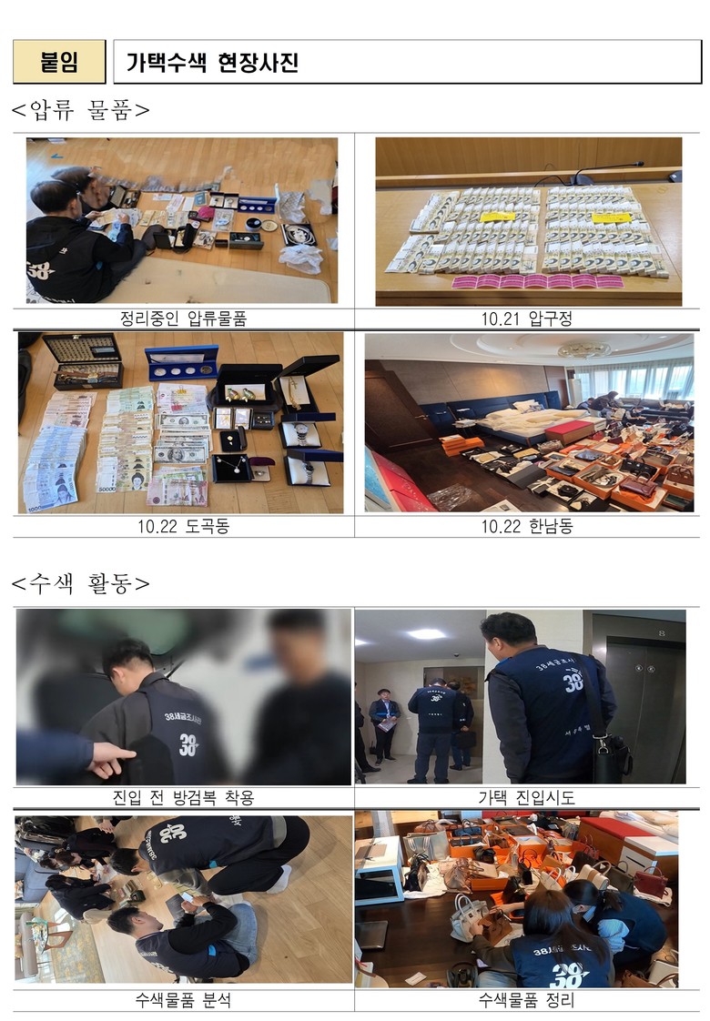 - 압구정·도곡·한남 등 고가주택 거주지 수색, 현금다발, 명품가방·귀금속 등 압류