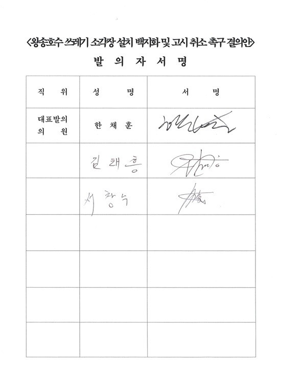 발의 의원들은 결의문을 통해 ▲소각장 계획 즉각 백지화 및 고시 취소 ▲요식 행위가 아닌 실질적 공청회 개최 ▲모든 행정 자료 및 협의 내용 투명 공개 ▲입지선정위원회 구성 및 과정 전면 공개 ▲환경 영향 분석 결과 공개 ▲시민 기만 행정에 대한 공식 사과 등을 강력히 요구했다.