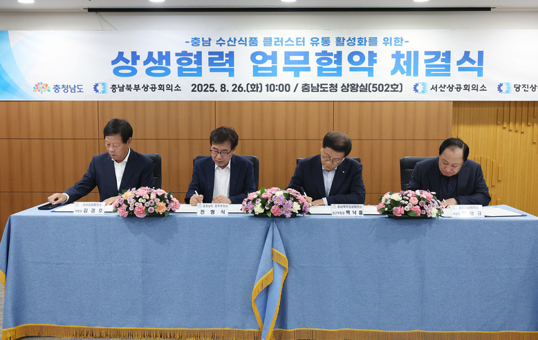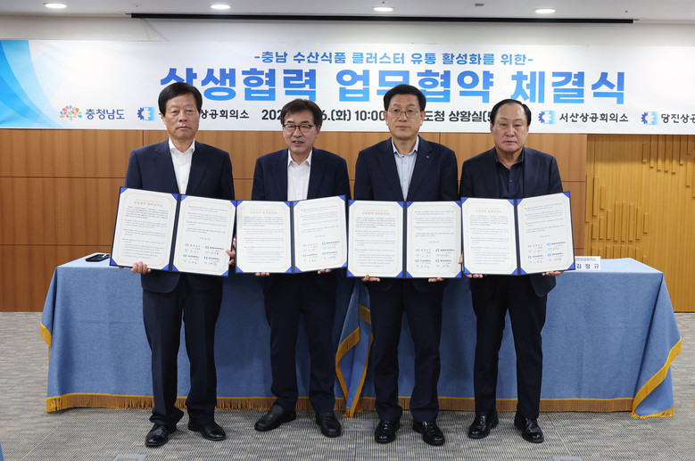 도는 26일 도청 상황실에서 전형식 정무부지사와 백낙흥 충남북부상공회의소 상근부회장, 김경호 서산상공회의소 부회장, 김창규 당진상공회의소 부회장이 ‘수산식품집적지구 유통 활성화 상생협력 업무협약’을 체결했다고 밝혔다.
