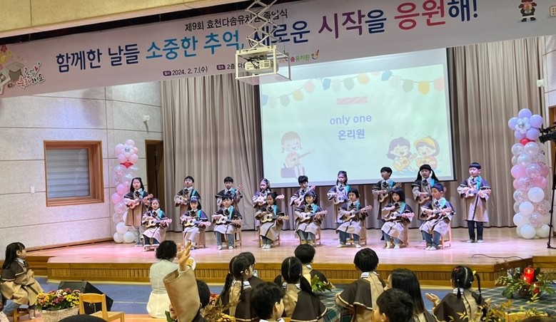 | ▲ 효천다솜유치원 졸업식에서 졸업생들이 우쿨렐레 공연을 하고 있다 |
