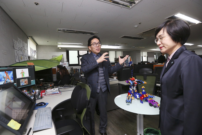 | ▲ 21일 서울시 강남구 논현동 ‘투바앤’ 본사에서 권선주 기업은행장(오른쪽)이 김광용 투바앤 대표이사(왼쪽)로부터 콘텐츠사업에 대한 설명을 듣고 있다. |