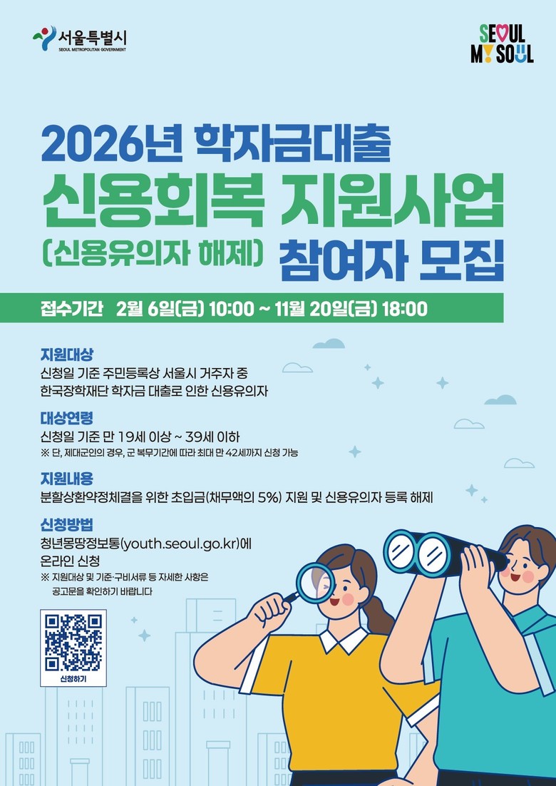 이번에 신청하면 2025년 하반기(7~12월)에 발생한 이자(등록금, 생활비 포함)를 지원받게 된다. 한국장학재단 학자금 대출을 상환 중인 서울 거주 대학(원) 재‧휴학생, 5년 이내 졸업생이라면 2월 6일(금) 오전 10시~3월 18일(수) 오후 6시 청년 몽땅 정보통 누리집(youth.seoul.go.kr)에서 신청할 수 있다. 최종 지원 대상자와 지원액은 7월 중 한국장학재단 누리집(www.kosaf.go.kr)에서 확인할 수 있다.
