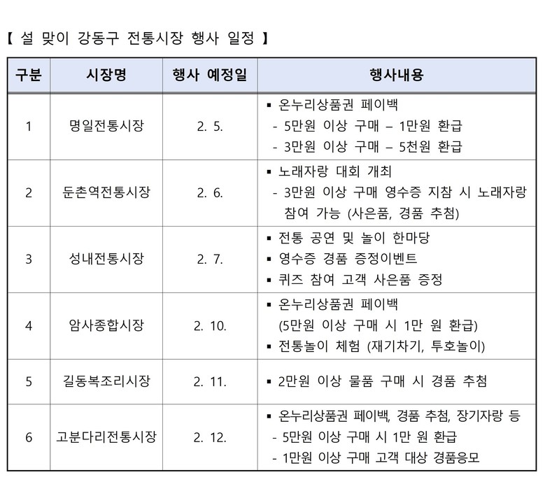 이와 함께 강동구는 설 명절 분위기 조성을 위해 관내 6개 전통시장을 대상으로 시장별 특성을 살린 자체 이벤트 행사도 지원한다. 고분다리, 길동, 둔촌역, 명일, 성내, 암사 전통시장에서는 제수용품 할인, 온누리상품권 환급, 노래자랑 및 장기자랑 등 다양한 행사가 2월 5일부터 12일까지 순차적으로 운영될 예정이다.