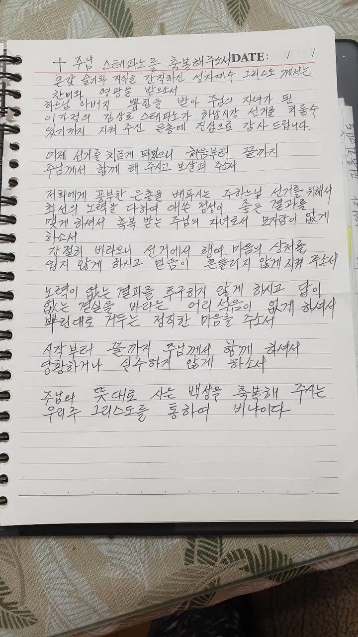 김상호 하남시장 후보의 노모 (老母) 가 아들을 위해 쓴 친필 기도문이 담긴 영상을 공개했다.