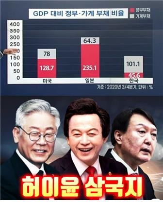 우리나라 국가부채는 GDP 대비 고작 45%입니다.